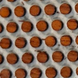 Padauk is a reddish brown wood. The photo has been greatly enlarged so it looks fuzzy, etc. but these are double laser cut dots that are very crisp and nice.